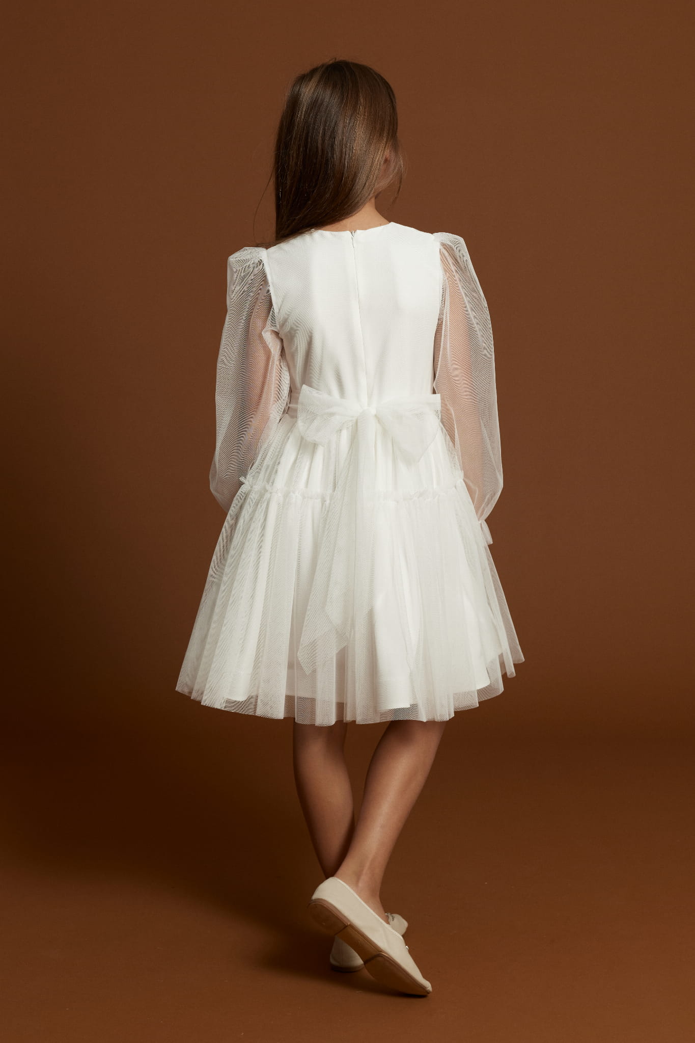 Este vestido de tule para menina foi desenhado a pensar nas grandes ocasiões da vida familiar portuguesa. Aqueles dias em que reunimos gerações à mesa, em que tiramos fotografias que ficarão na parede da sala, em que queremos que tudo seja perfeito.