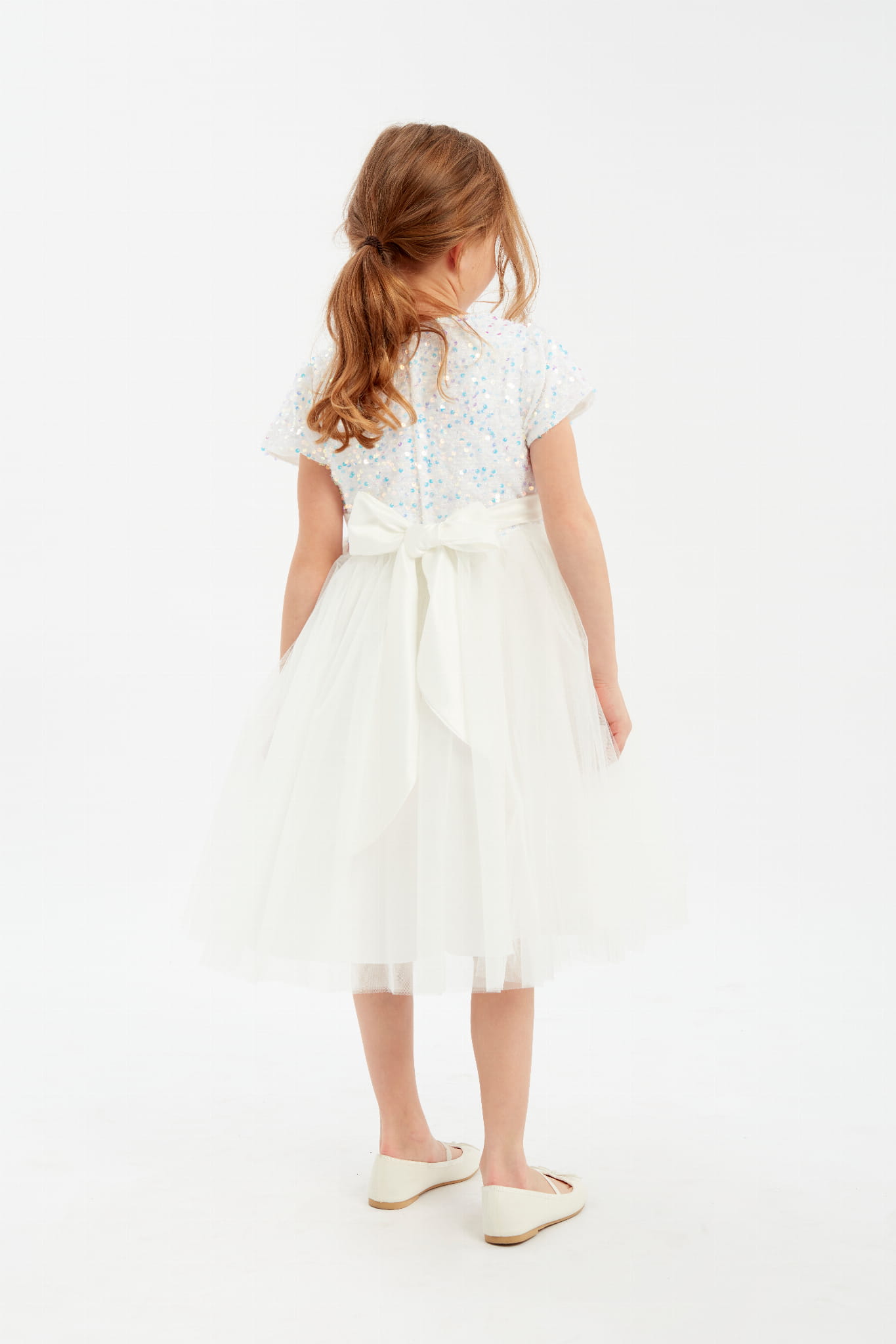 Procurando uma roupa elegante e sofisticada para sua filha? Apresentamos a você a encantadora e estilosa vestido de festa para meninas Elisa em branco com cintilantes cekins azuis.